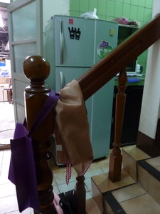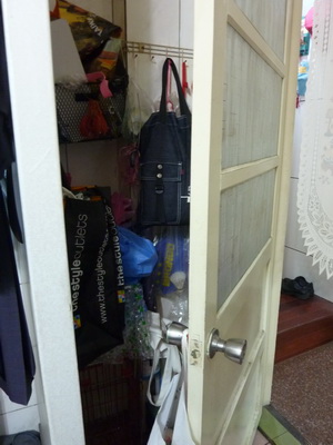 進廚房的門後掛滿了袋子及物品,門難以全開。
