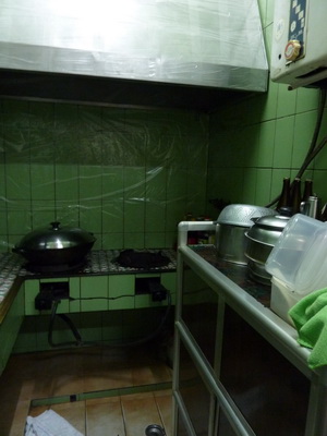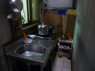 很明顯的,這個廚房是房子最後段加蓋出去的。為了增大利用空間,常將防火巷加蓋做廚房,這樣的廚房位置應:
