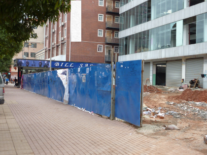 此棟商場因前方右建築橫出,已經蓋了相當時間,多次營業開張,商場生意均無法凝聚人氣而關門,只因乞丐手擋住來氣方。