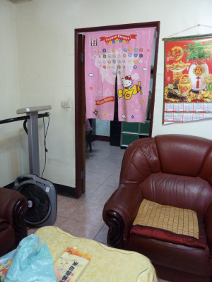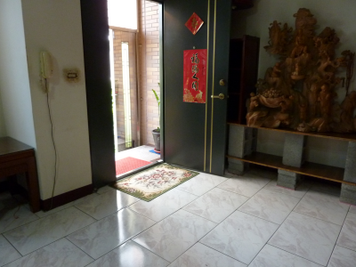 入門擺設因背客格局,且通道逼窄,玄關櫃在門後,木雕觀音菩薩佛像立於右。