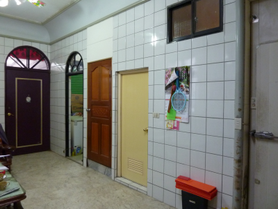 入門擺設因背客格局,且通道逼窄,玄關櫃在門後,木雕觀音菩薩佛像立於右。