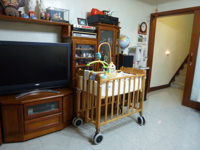 為了方便照顧小嬰兒,娃娃床就放在大人能看顧到的地方。