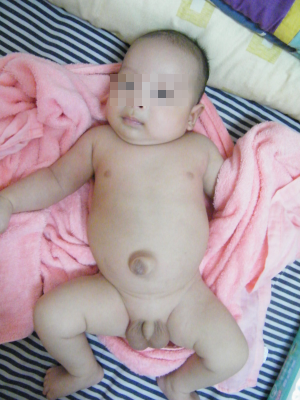 孩子出生後,肚臍眼位置凸了出來,就好像一根管子模樣,約莫五公分長(與家中接的管子相似)。